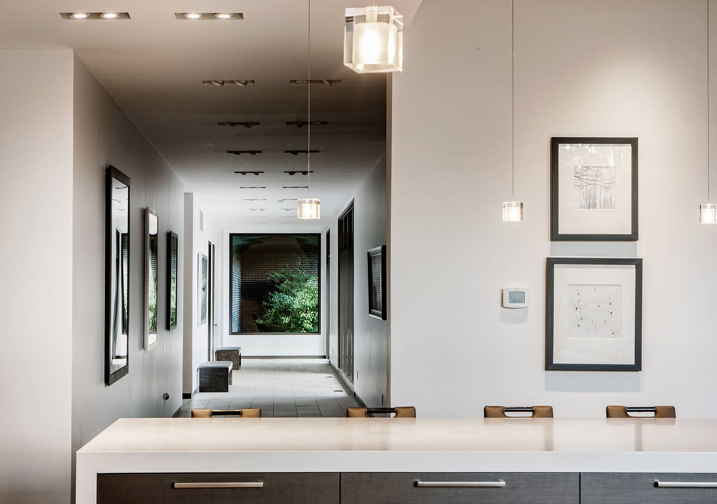 A new home construction for an active family in Ladue, Missouri. This beautiful house features a formal courtyard in the front, open living spaces and a pool courtyard in the back linking to a gym and bowling alley.